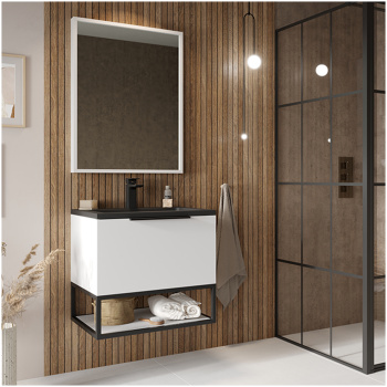 The Grandeur Mirror is a unique addition to any bathroom. It features a dimmable cool white LED strip around the front of the glass, surrounded by a black metal frame and faux leather strap. It has an integrated speaker with Bluetooth connectivity that lets you play music anytime you are in your bathroom.