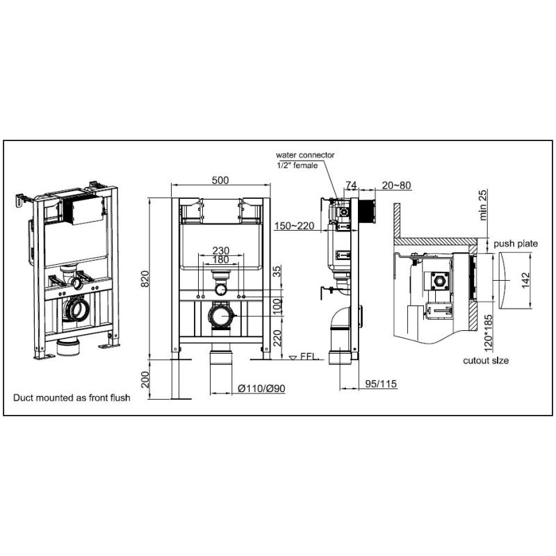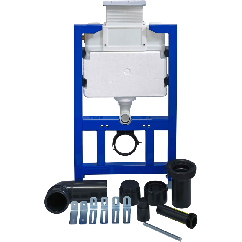 Our in-wall frame is compatible with our wall-hung toilets and flush plates. It comes with a chrome flush plate and all the components required for installation.